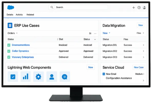 Examples of the platforms and use cases we deliver for teams worldwide: ERP integrations, clean migrations, automation-ready data and responsive Lightning experiences.